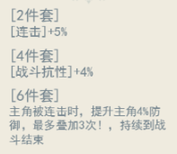 3、每种套装效果都分为:2件套、4件套、6件套。分别提供加成:战斗属性、全战斗抗性、特殊技能效果。套装效果只在战斗中生效。